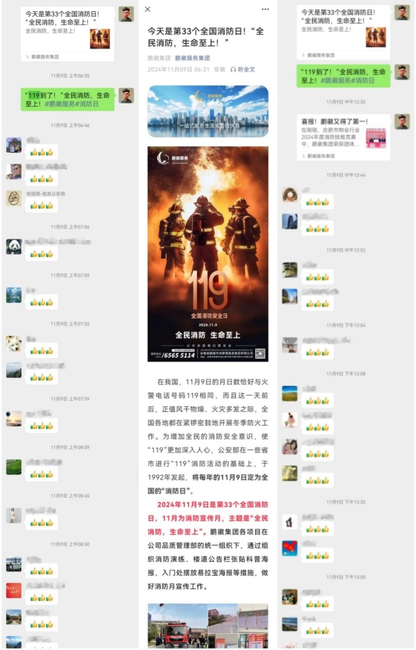 在鵬徽集團安委會(huì )的統一領(lǐng)導下,各項目采取了多種措施確保消防月的宣傳工作得到有效執行,包括在樓道公告欄張貼統一設計的科普海報,以及在入口處擺放易拉寶海報等。此外,公司還通過(guò)公眾號和微信朋友圈積極開(kāi)展了119消防日的線(xiàn)上宣傳活動(dòng)。